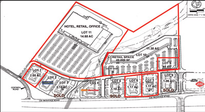 Construction timeline (start/completion dates): Construction is set to begin December 1, 2008, with estimated completion in August 2009. Pad sites will be available in the second quarter of 2009.